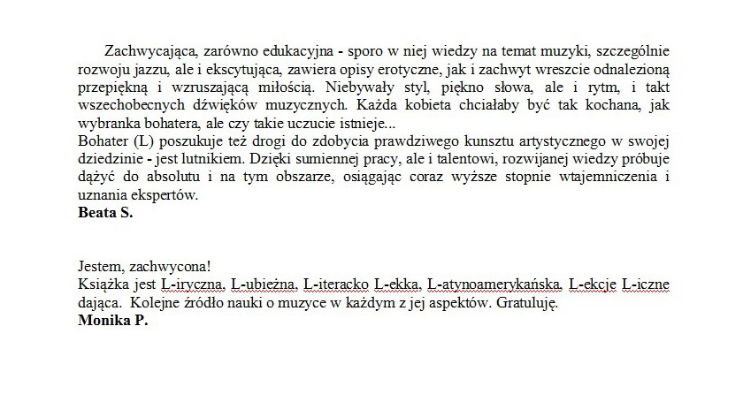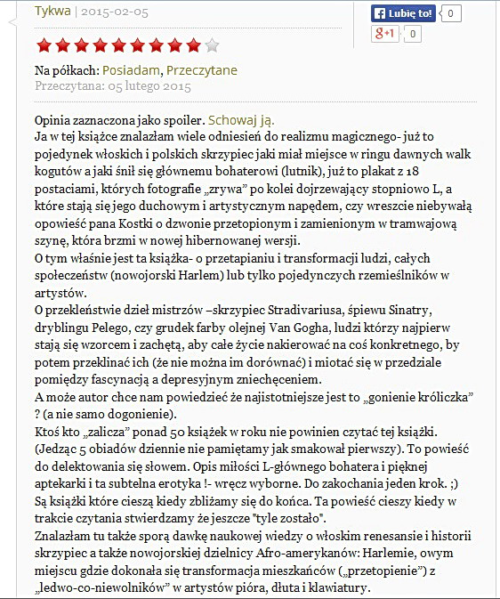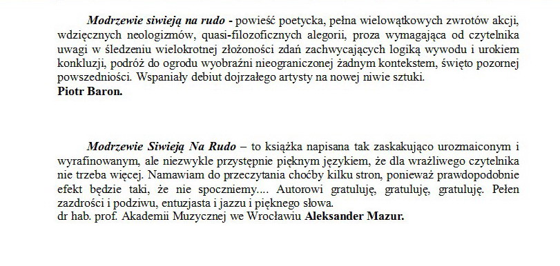 Nie z gęsi to pierze, lecz skrzydeł anielich dłutem skubane pnie świerków i klonów obrączką wiórkową podłoga się ścieli dwie chwile a lutnik dotrwa swych plonów Złoto-rdzawy lakier drewnu bladość bierze w artysty błagania Bóg Pan wsłuchał wielce wyklęczonych modlitw cichutkie pacierze trafiły do celu niczym list w butelce Jaworowe pręgi mienią się i drgają poezja w fizyce- coś z pryzmatu mając hebanowy krawat koszulę świerkową u szyjki związany zdobi czarny sobą Podstawek w ażurach wziął już na swe barki strunowe druciki kwintami strojone muzyka popłynie- tylko wsiąść do arki w cmentarze i w tany i w łąki zielone Patyk z końskim włosiem wyczynia już cuda i skacze i sunie i trze strun ździebełko sen to czy jawa, czy ucha ułuda? to skrzypce, sklejone w czarowne pudełko Ze szczelin w kształt efów florefów wyciętych Jak perfum zapachy, z olejków ściśniętych Tak piękno muzyki zostając- umyka To pyłek - strzepany z fartucha lutnika.