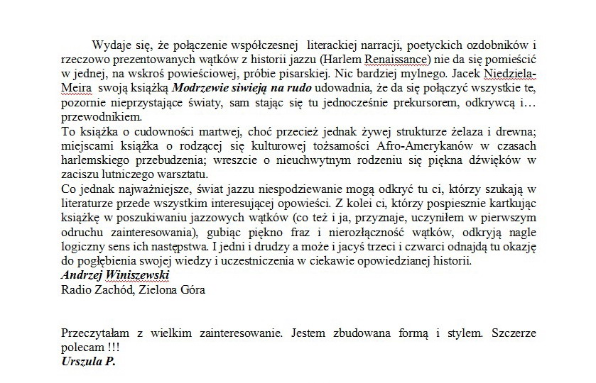 Białym był mój staruszek Moja matka-czarną Jeślim kiedy plótł klątw wianuszek Zrywam ozdobę ojca - marną Jeślim ku piekłu wysyłał Złorzecząc matczynej skórze Rozumny cofam dziś klątwę Spoglądam ku niej - na górze Ojciec zmarł w pięknym domu Moja mama w chacie marnej A gdzie - dumam - umrę ja? O krwi ni białej ni czarnej... (przekład JnM, tytuł wiersza na podstawie sztuki Langstona Hughesa "Mulatto")